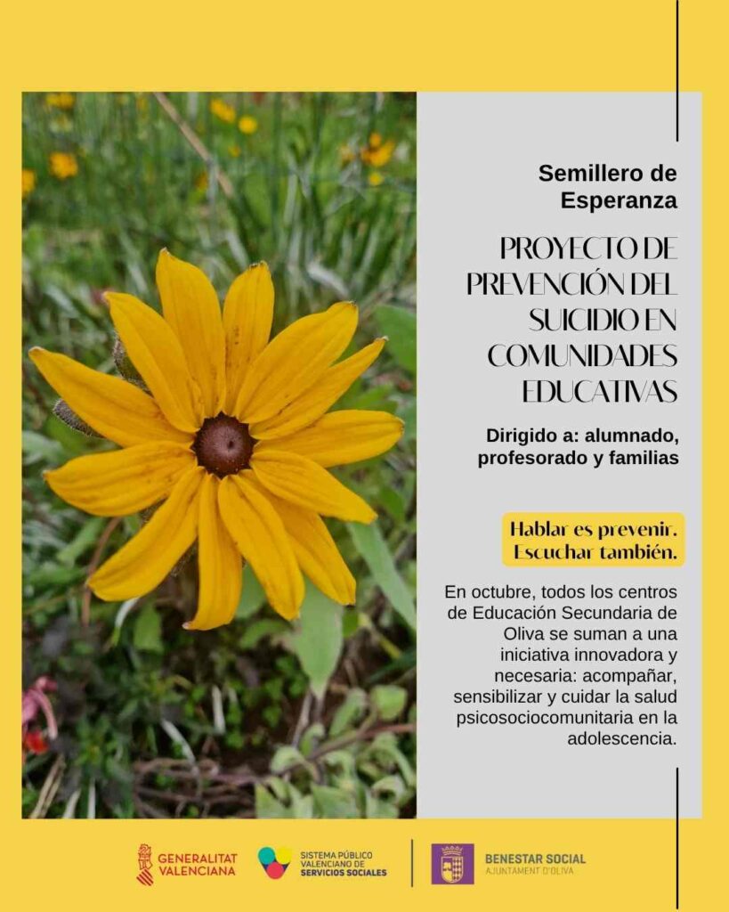 Hablar de suicidio salva vidas. Y hacerlo desde la escuela es, sin duda, una de las formas más poderosas de sembrar futuro. Desde junio hasta noviembre de 2025, el Ayuntamiento de Oliva ha apostado por una mirada valiente y comunitaria al poner en marcha el proyecto Semillero de Esperanza, impulsado por La Niña Amarilla y con el apoyo de la Concejalía de Servicios Sociales de Oliva.